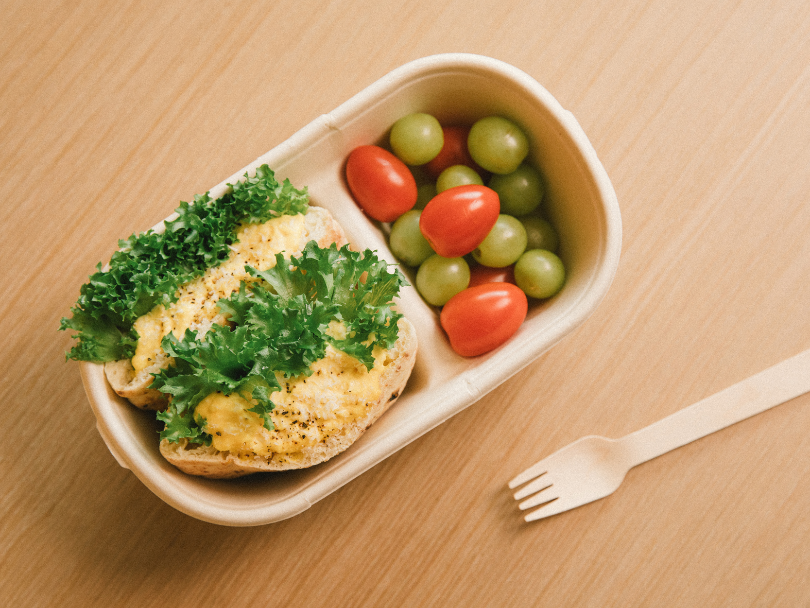 한 입에 가득 차는 부드러운 에그마요 샌드위치와 방울 토마토