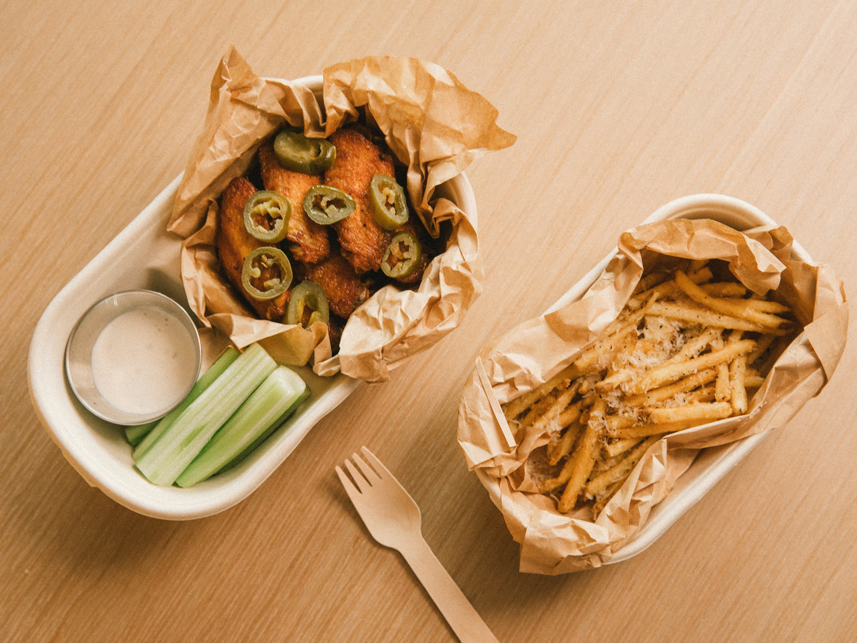 매콤새콤한 버팔로윙과 치즈가 뿌려진 감자튀김, 샐러리